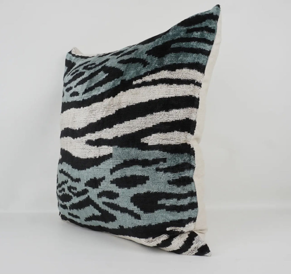Zebra patterned 100% silk velvet Ikat throw pillow-mist/black