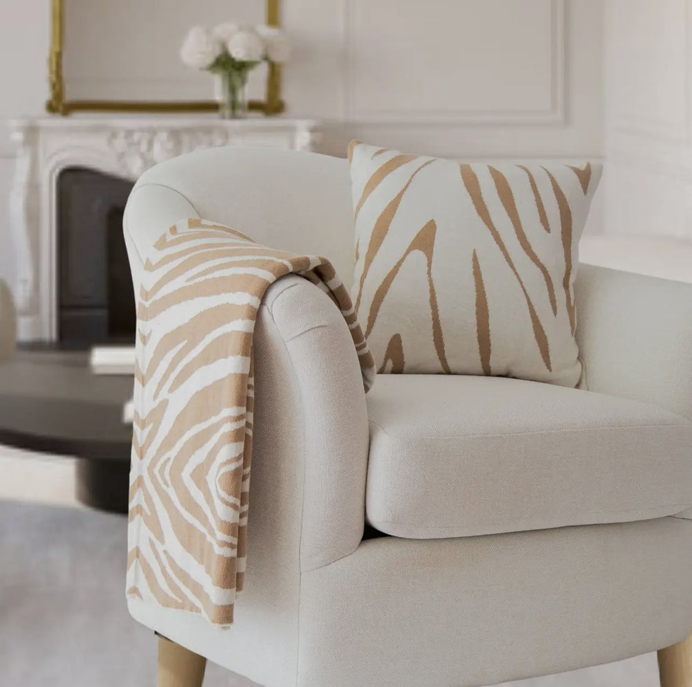 Elevate your home decor with this zebra patterned 100% cotton knit throw blanket, featuring a modern yet classic design in updated colors of tan and white. Crafted from soft cotton knit, this lightweight throw offers a lush hand feel and weighty stretch, making it a cozy addition to any space. This fully reversible design adds versatility, while the yarn dyed fabric ensures vibrant, long lasting color. Perfect for draping over your sofa, or chair or adding an extra layer of warmth to you bed. 50"x60". Machine wash. Made in India.