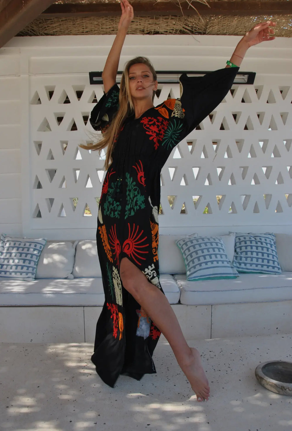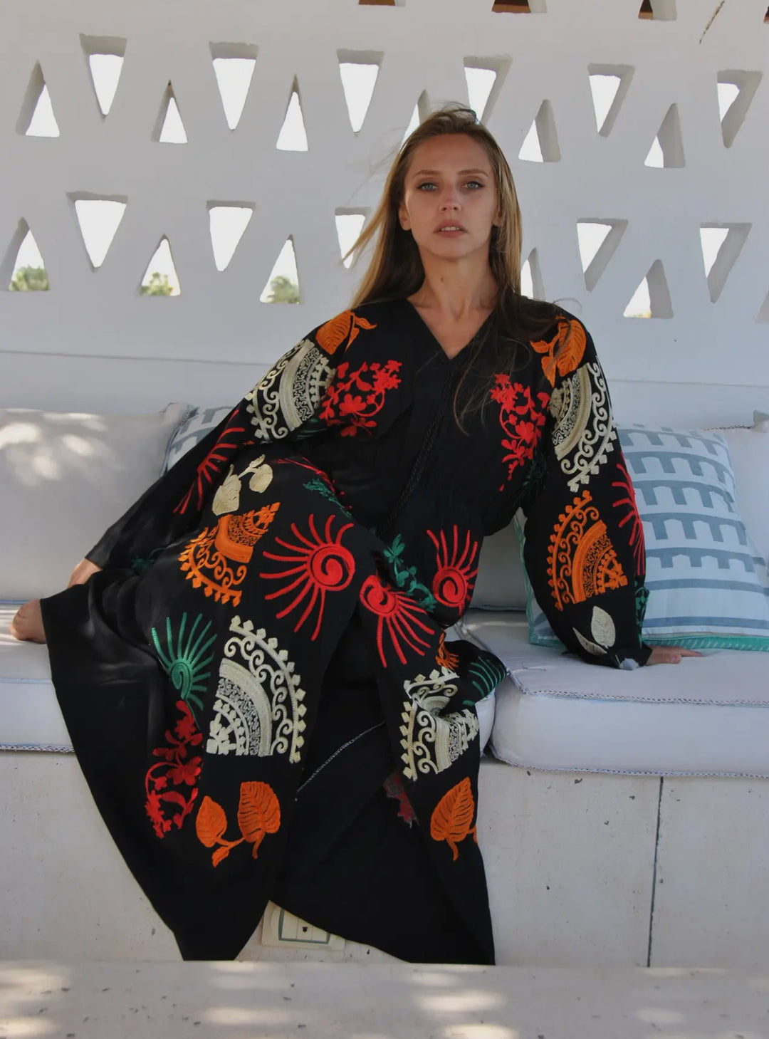 Wear this stunning piece out on the town with a pair of heels or just relax at home in this comfy and colorful embroidered kaftan imported from Egypt. It's made with 70% Egyptian cotton and 30% polyester for a comfortable but beautiful statement piece. Size is one size: S/M/L in one.