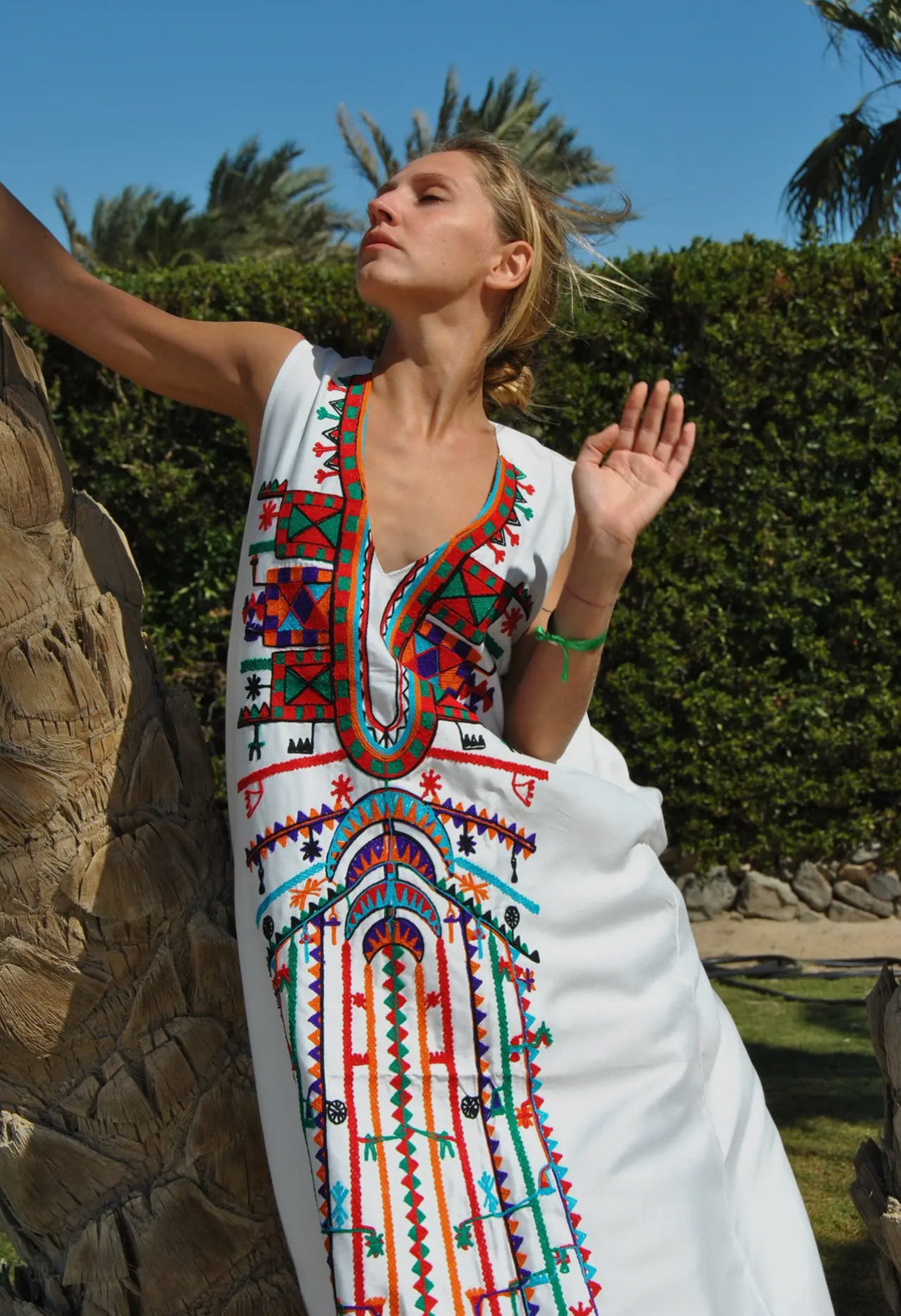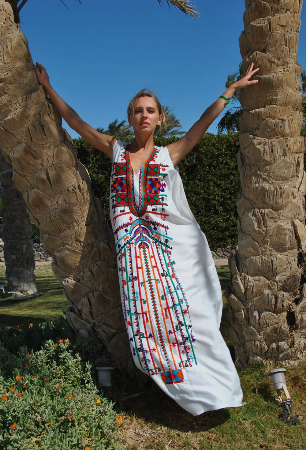 Become a Boho Queen in this colorful embroidered kaftan, made by in Egypt. The fabric is an Egyptian cotton/poly blend. Wear it on a night out on the town with some heels or just relax at home with this comfy but colorful piece. Size M. See size chart. Imported from Egypt.