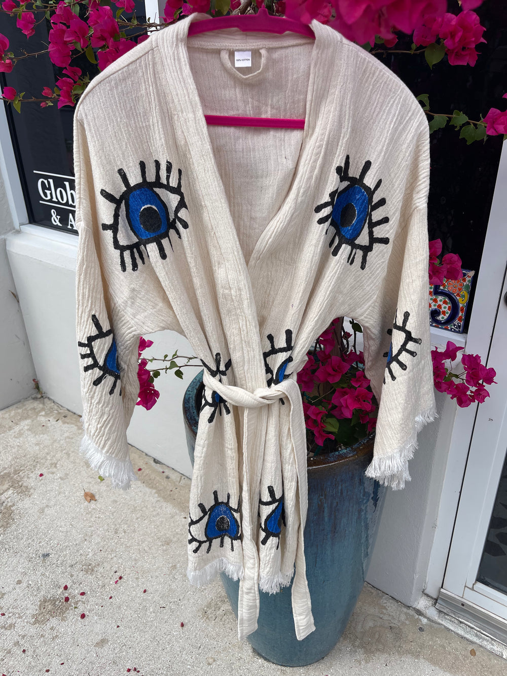 This one of a kind, hand stamped short Kimono robe was made by skilled artisans in Turkey. This 100% organic cotton robe feels super soft and luxurious. This piece will add a Boho flair to any wardrobe with its blue and black evil eye motif. Wear it by the pool, after the beach, or for just lounging at home. One sizes fits most. Hand wash.