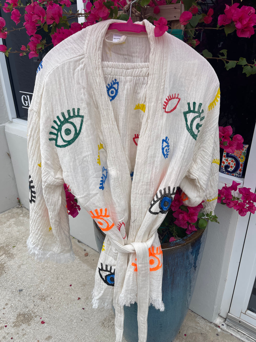 Add a touch of Boho style to your wardrobe with this whimsical Kimono robe with matching shorts. With multi colored evil eye motifs, this will quickly become your favorite go to item for lounging by the pool, after a day at the beach or for just relaxing at home. Made from 100% organic cotton and hand stamped by skilled artisans from Turkey, this soft and cozy set is comfortable and stylish. Size S-M. Hand wash.