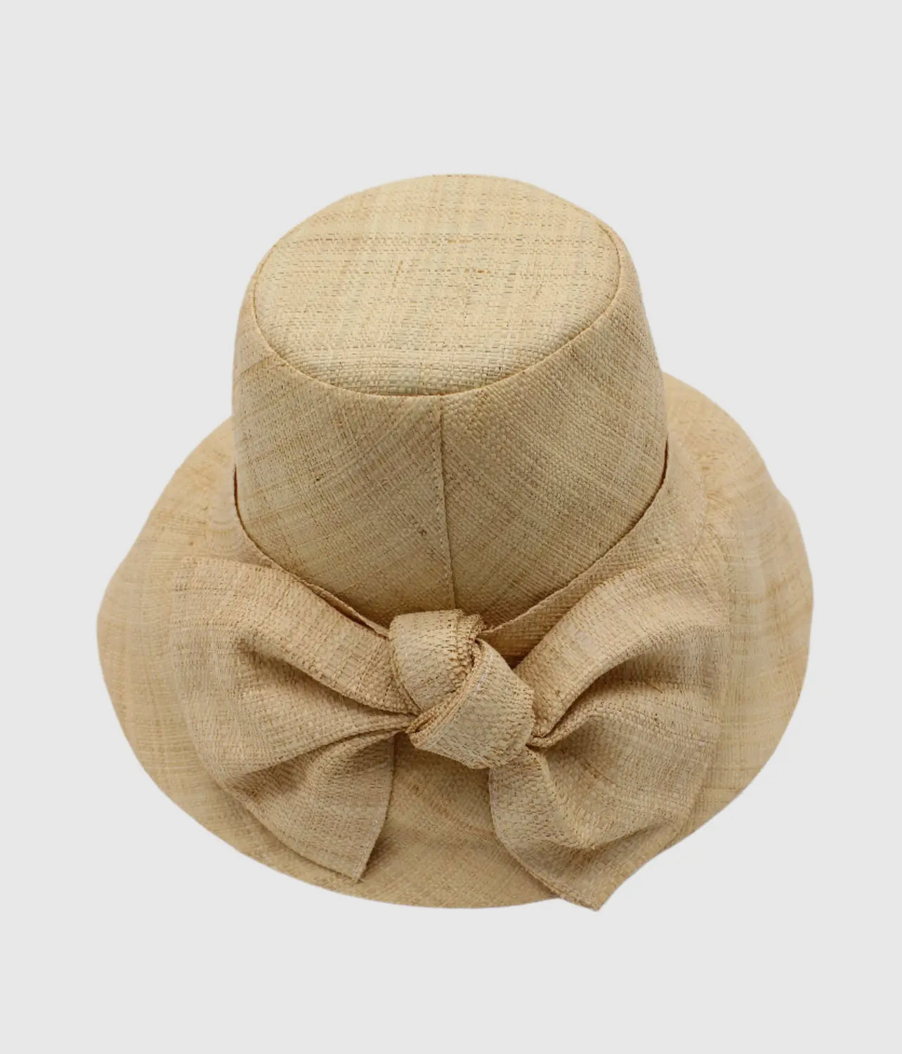 This classically styled bucket hat is made with natural raffia palm fibers by skilled artisans in Madagascar. It's both functional and fashionable. Complete with a big raffia bow and coordinating hat band, it offers ample sun protection and adds a touch of styel to any outfit. Brim 3".