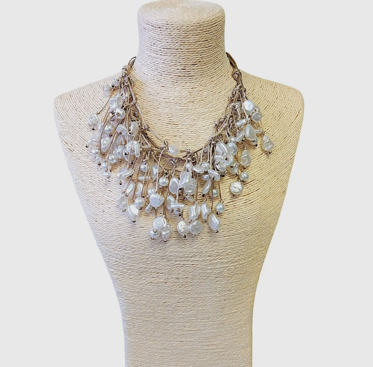 This statement piece will surely elevate any outfit with it's Boho styled fringed pearl accents. Features glass pearls and mixed coin pearls with a knotted leather cord in light beige. Comes with a lobster claw closure.