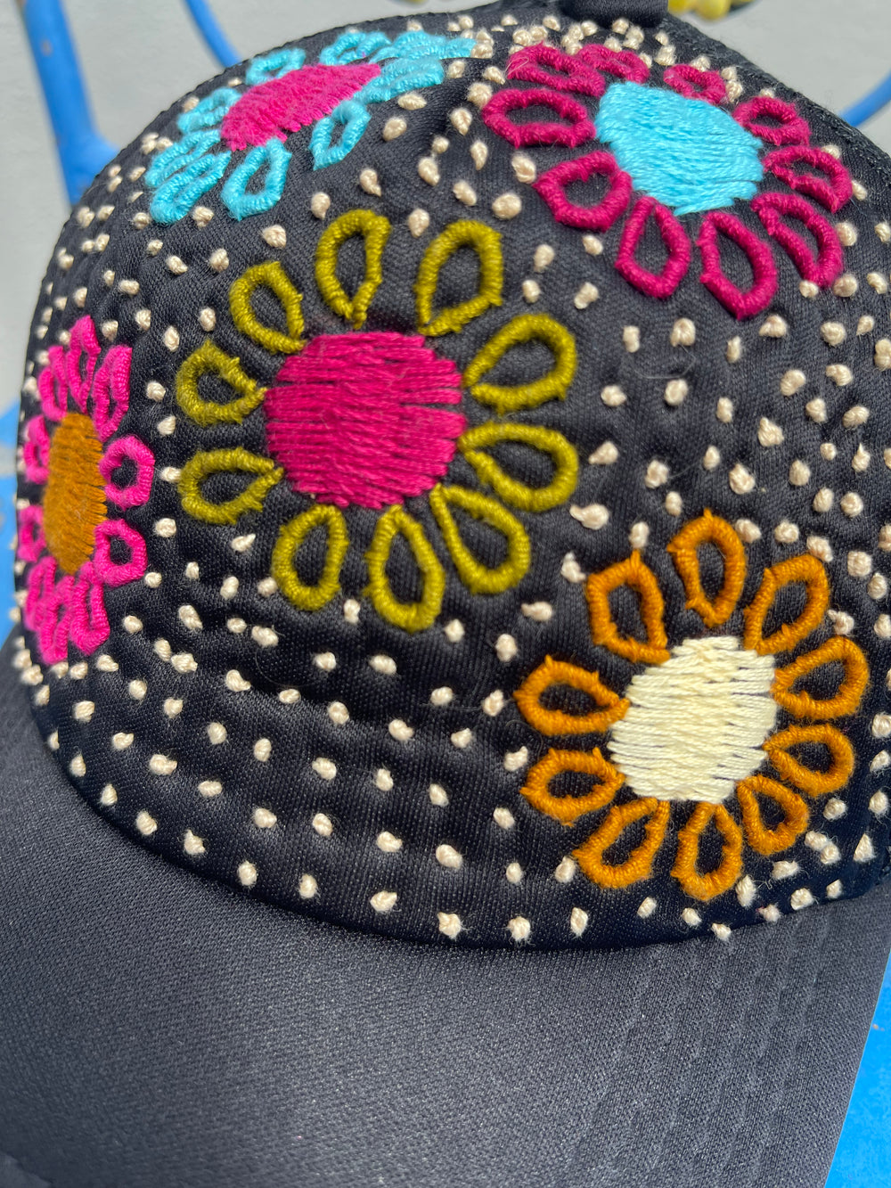 Hand crafted in Chiapas, Mexico, this Tulum hand embroidered trucker flower hat took three days to carefully embroider by a skilled woman, making this a true work of art!  Make a fashion statement while supporting women artisans with this one of a kind trendy fusion of traditional Mexican embroidery and the latest fashion trends. Join the #goodfashiongoodkarma movement and feel good about the impact your purchase is making around the world! One size snap back in mesh blend.
