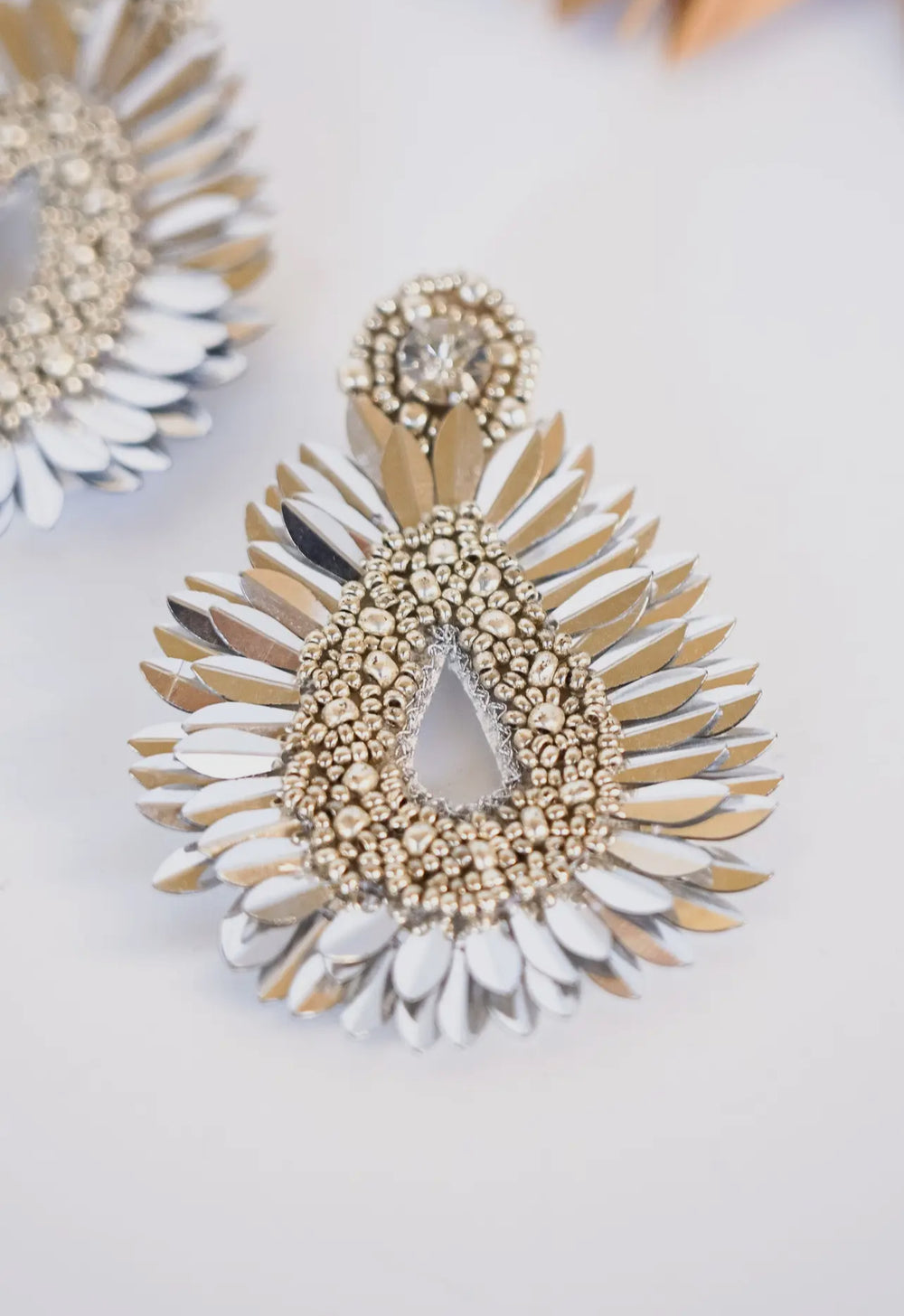These lightweight earrings feature intricate beading, shimmering rhinestones, and silver accents, creating a stunning effect perfect for festive celebrations. With a soft felt backing, they provide comfort while making a bold statement. Ethically made in Bali, Indonesia.
