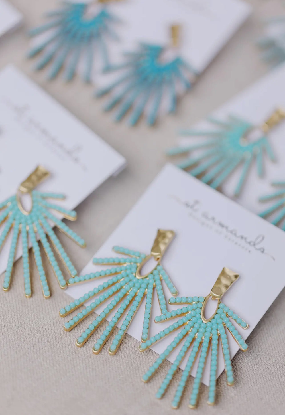These stunning light turquoise starburst earrings will make a statement with any outfit. With hammered gold hardware, these are not only lightweight but a perfect addition to your summer wardrobe. 2" long. Made in USA. Post back.