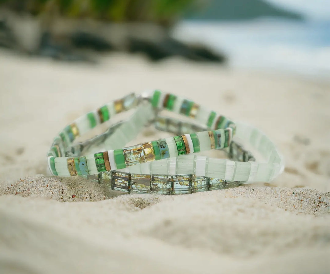 This bracelet is a perfect blend of strength, durability and style. Each bracelet is expertly crafted with high quality crystal elastic and glass tile beads, ensuring that they are strong and long lasting. This means you can wear them wherever you go-at the beach while working out or even in the shower. Made in the U.S.A. Wear it alone or stack it with others for a one of a kind look.