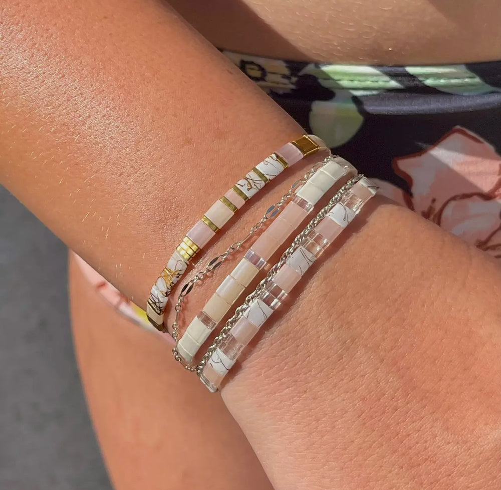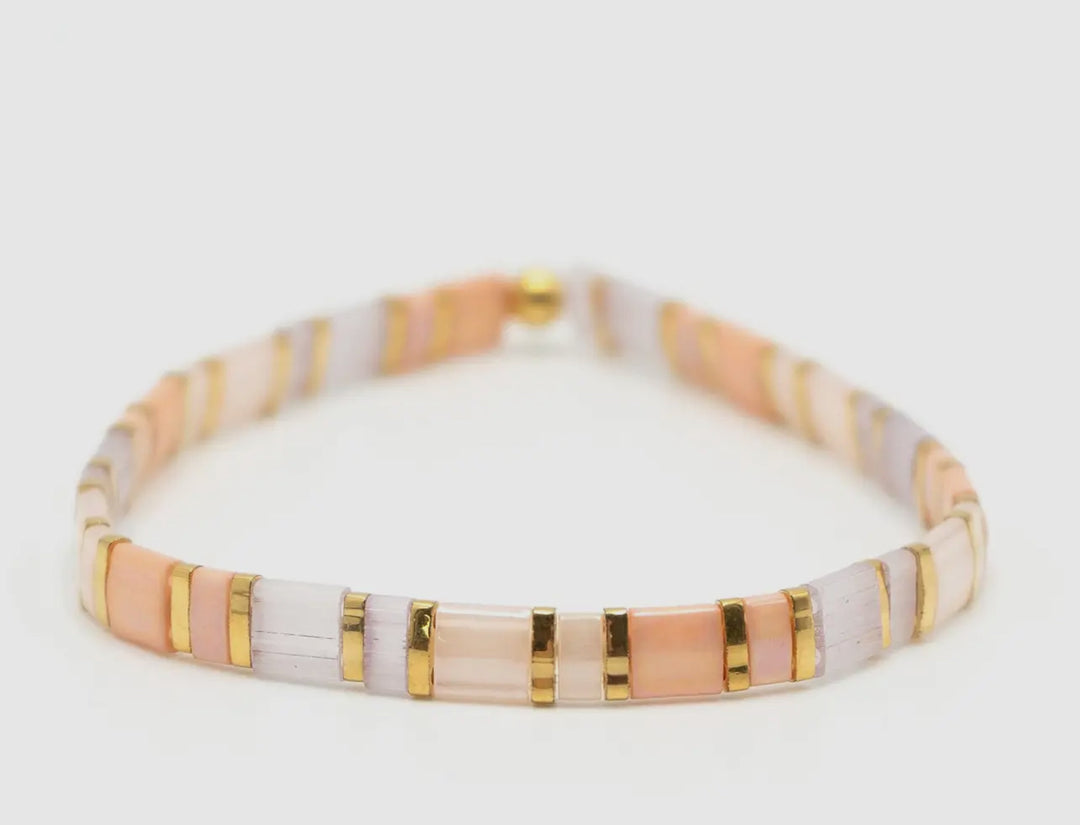 This bracelet is a perfect blend of strength, durability and style. Each bracelet is expertly crafted with high quality crystal elastic and glass tile beads, ensuring that they are strong and long lasting. This means you can wear them wherever you go-at the beach while working out or even in the shower. Made in the U.S.A. Wear it alone or stack it with others for a one of a kind look.