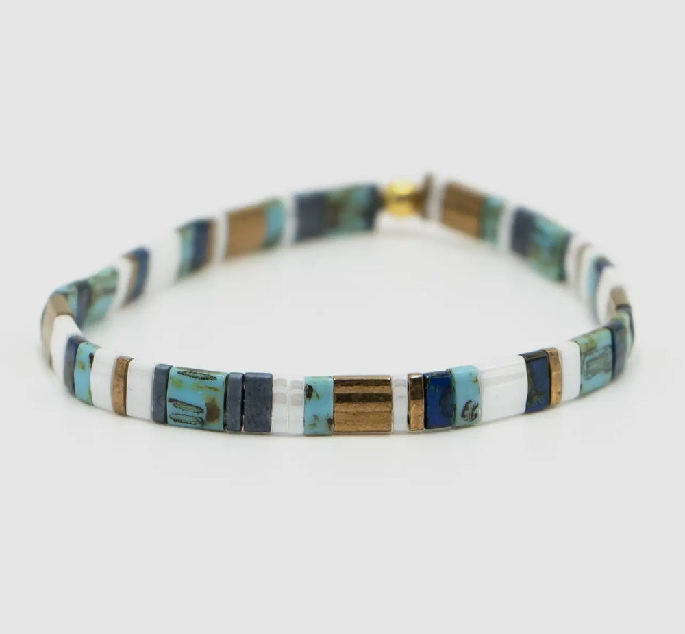 This bracelet is a perfect blend of strength, durability and style. Each bracelet is expertly crafted with high quality crystal elastic and glass tile beads, ensuring that they are strong and long lasting. This means you can wear them wherever you go-at the beach while working out or even in the shower. Made in the U.S.A. Wear it alone or stack it with others for a one of a kind look.