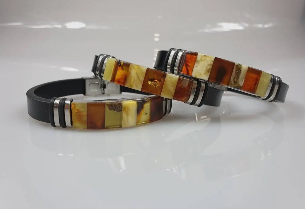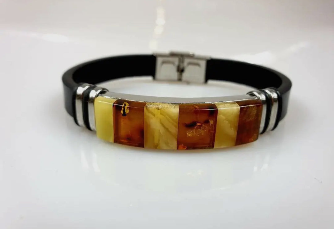 Elevate your style with this unique and hand made statement bracelet, crafted by a skilled artisan from Lithuania! Featuring an adjustable leather band, stainless steel clasp and authentic Baltic Amber which is millions of years old! Because of it's hand made nature and natural stones, no two bracelets are identical!