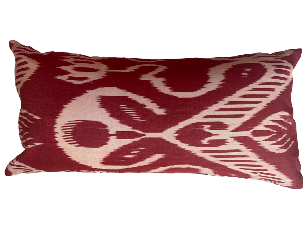 This hand embroidered silk Suzani pillow is truly a one of kind masterpiece, hand made by skilled artisans in the mountains of Turkey. This beautiful floral motif is on the front and the back has a co-ordinated silk ikat. It comes complete with a plush insert and hidden zipper. It's 14" x 29". Spot clean.
