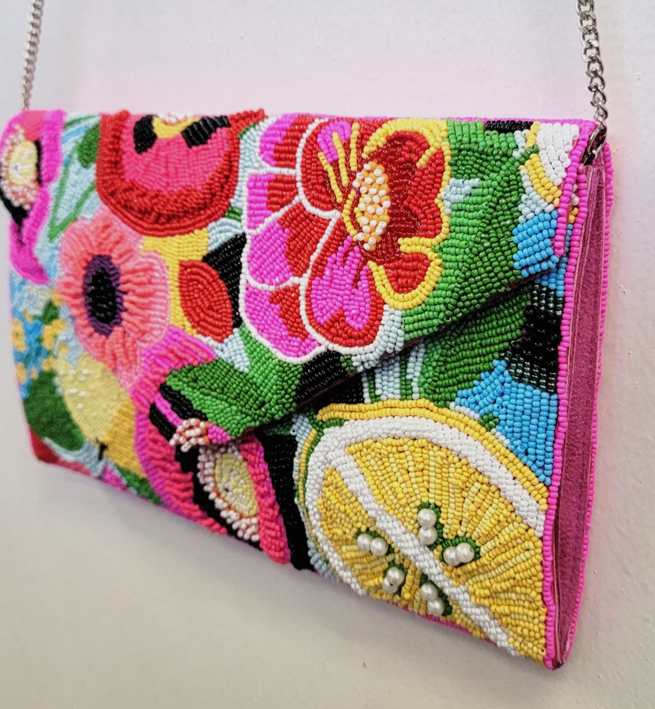 This fabulous hand beaded clutch is piece of art! Featuring a stunning tropical floral design, this bag will get raves from everyone who sees this unique, one of kind purse. Wear it on special occasions or for a night on the town! Hand made by skilled artisans in India. this clutch is 10"x6". Comes with a satin lining and chain strap and is beaded on all sides.