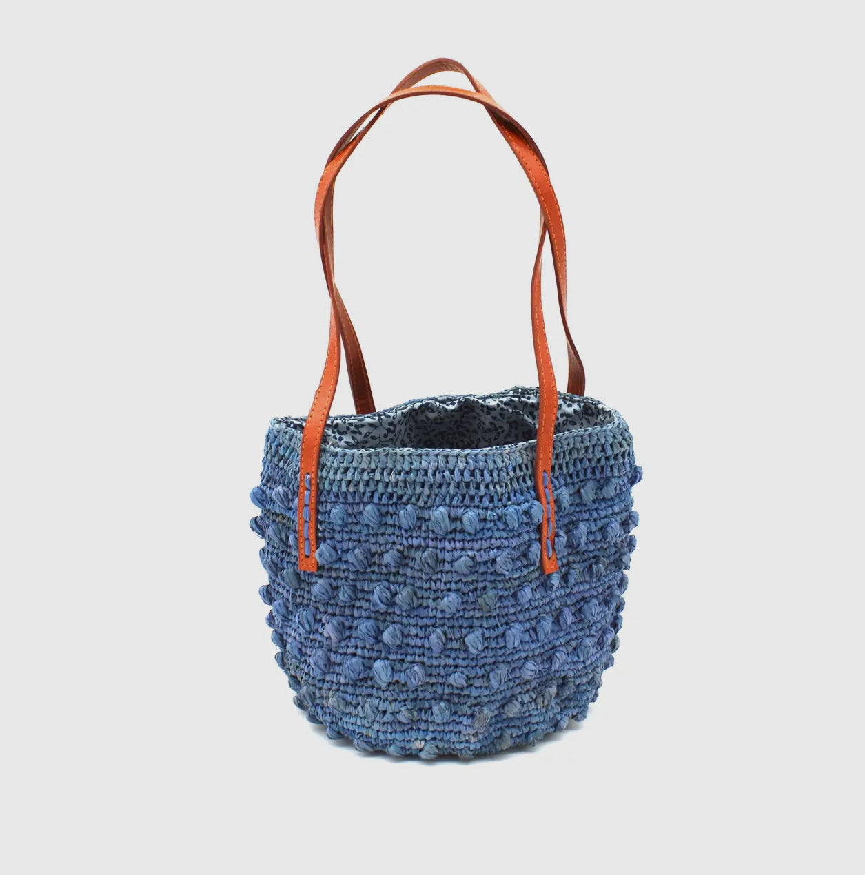 This super cute crocheted straw basket bag is made by skilled artisans from Madagascar. It features a perfect blend of style and craftmanship and is expertly handcrafted from natural raffia palm fiber, give it a unique nub texture and eye catching hand dyed color. With a fully lined interior and inside pocket, as well as leather handles and as assorted print drawstring closure. It's both functional and fashionable. Dimensions: 9"x7"x9".