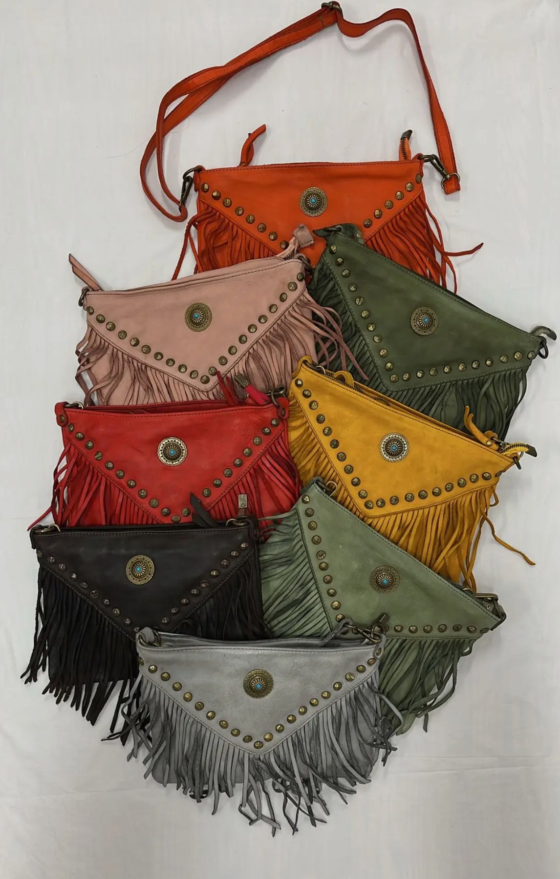 This vintage styled genuine leather cross body bag features soft leather, fringe and metal studs and accents. It has a zipper opening and a long matching leather strap. Made in Italy by skilled artisans, this Boho styled bag will be your go to bag for a night on the town.