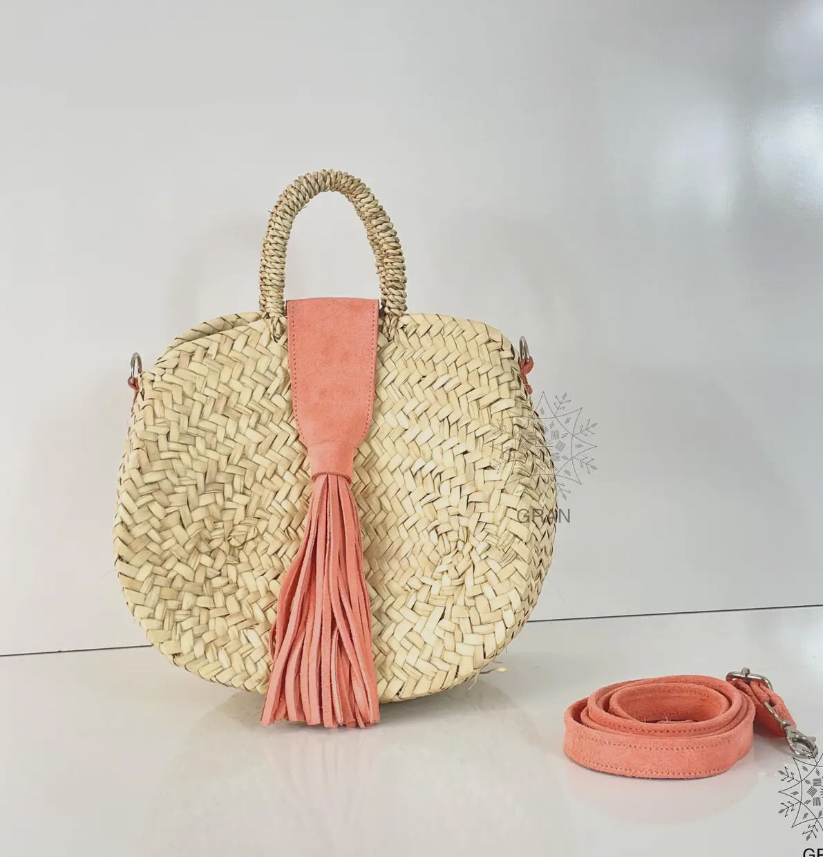Step out in style with this natural woven straw and leather crossbody bag, hand made in Morocco by skilled artisans. This stylish handbag combines bohemian flair with every day functionality. This bag features a natural colored straw and pink blush leather accents.