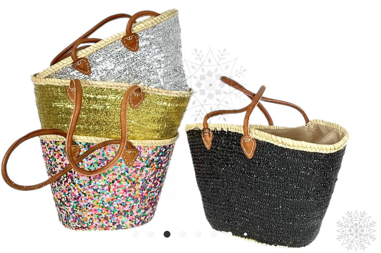 Discover chic sustainability with this stylish tote bag, hand made in Morocco. Blending both functionality and a unique elevated style, this woven bag will become your go to bag for market days, a day at the beach or just to carry for every day use. It features a fully covered sequin body and authentic leather handles. 19.7"x13.8".