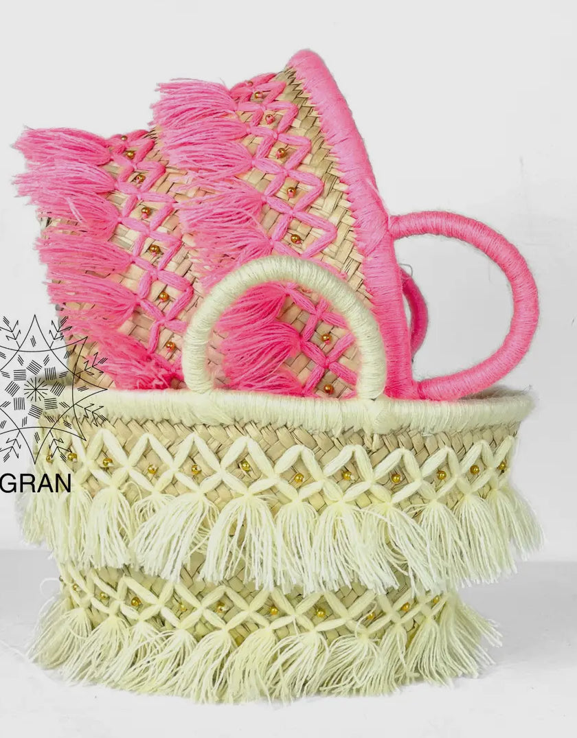 This exquisite hand woven Moroccan basket bag is perfect for many occasions. Elevate your style with this stylish tote which is perfect for beach outings, a special lunch date or for a day at the local market. Crafted with care from durable straw for long lasting use and featuring decorative tassels for a pop of color, each bag offers a unique touch of tradition. 11.5"x 7". Made in Morocco.