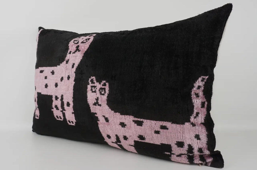 100% Silk Velvet Ikat Limited Edition Cat Pillow 16"x24"-Black and pink