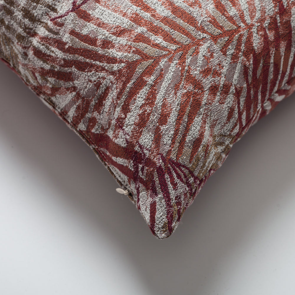 This woven tropical motif will liven up any decor. With hues of cranberry, burnt orange, cream and tan. Made with 100% polyester for easing cleaning. Imported from Europe. 18" x 18".