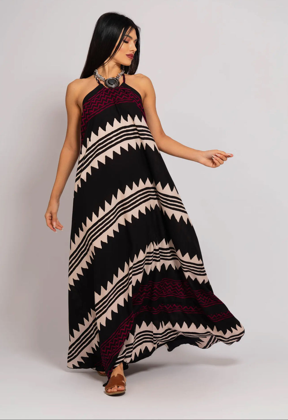 Boho Styled Aegean Strap Dress-Black/wine/cream