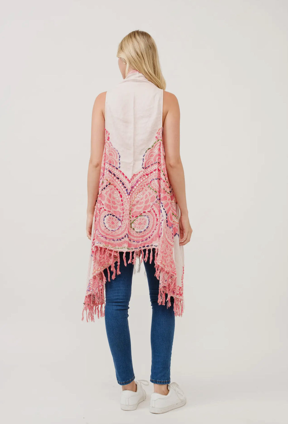 This versatile piece will refresh any wardrobe. Layer this hand embroidered vest over jeans, shorts, skirts or slacks for that Boho style. With its thick stitch embroidery , this piece will elevate any outfit with its delightful coral and white color and delicate features. Slight variations in embroidery are characteristic and should not be considered flaws or defects. 100% rayon. Hand wash or dry clean only.