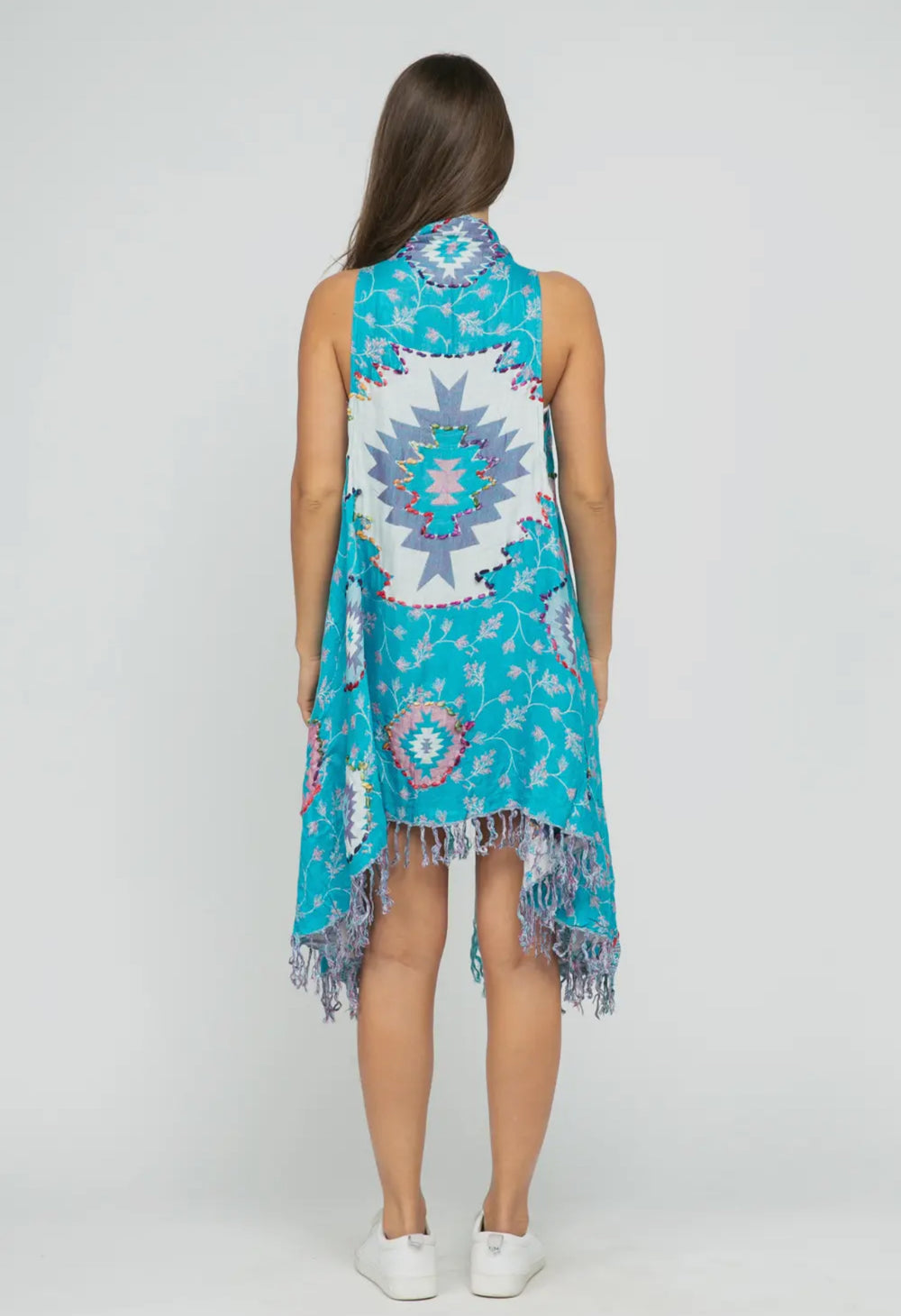 This stunning vest is detailed with thick stitch embroidery and bold patterns. Refresh your wardrobe with this Boho inspired piece. Easy to layer and perfect over jeans, shorts, slacks or a simple dress. Slight variations in embroidery are characteristic of hand embroidery and should not be considered as a defect or flaw. One size fit most. 100% rayon. Hand wash or dry clean only.