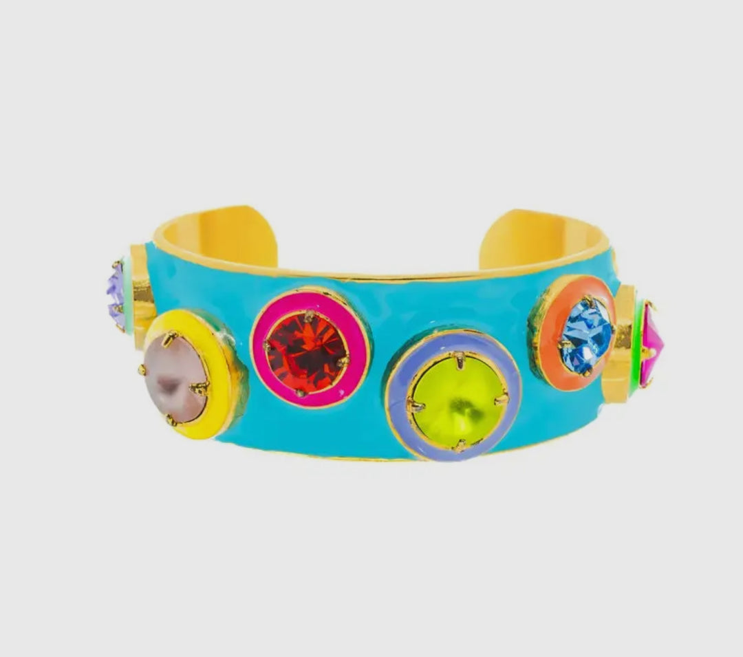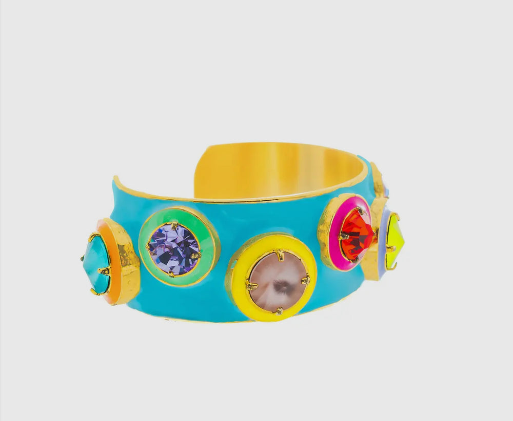 Show off your edgy style with this colorful and modern cuff bracelet! Hand made by a talented Montreal based jewelry designer, this piece will surely turn heads! It features hand painted enamel adorned with pops of color and high quality crystals. It guarantees quality and style, so slip it on and make a lasting impression!