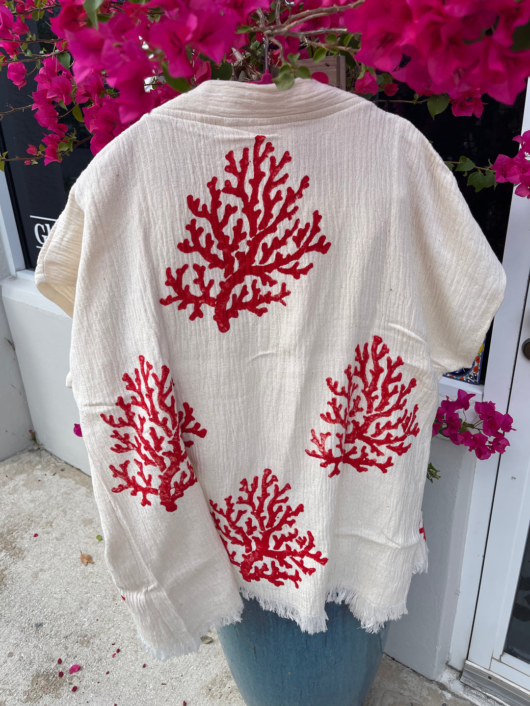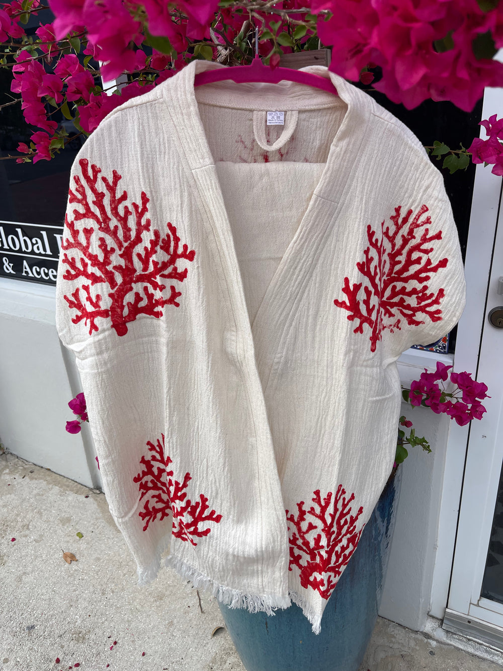 This stylish Boho styled loungewear set is hand block printed in Turkey by skilled artisans. It's made with 100% organic cotton with a whimsical red coral motif. Includes a crop sleeved cover up and elastic waistband pull on pants. Wear it to the beach, out for a day of shopping or yoga or just to relax at home. It's super soft and cozy. Size Medium. Hand wash.