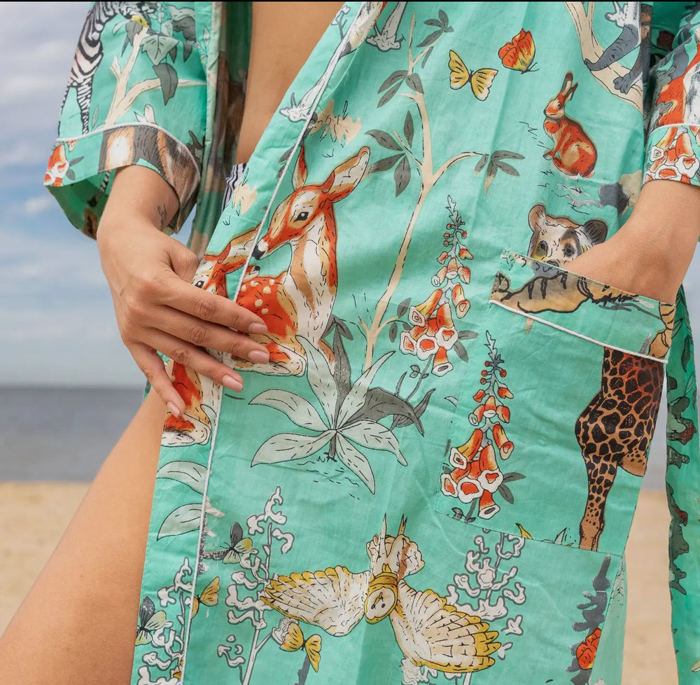 Cozy up in this whimsical hand blocked printed 100% cambric cotton Kimono robe. Designed in Australia and printed by skilled artisans in India, this soft and comfortable kimono robe can be worn while lounging at home binging on Netflix, for getting ready in the morning, or as a cover up by the pool or beach. Made in limited quantities. Comes with matching belt and two pockets. One size fits all. Machine wash/cool dryer.