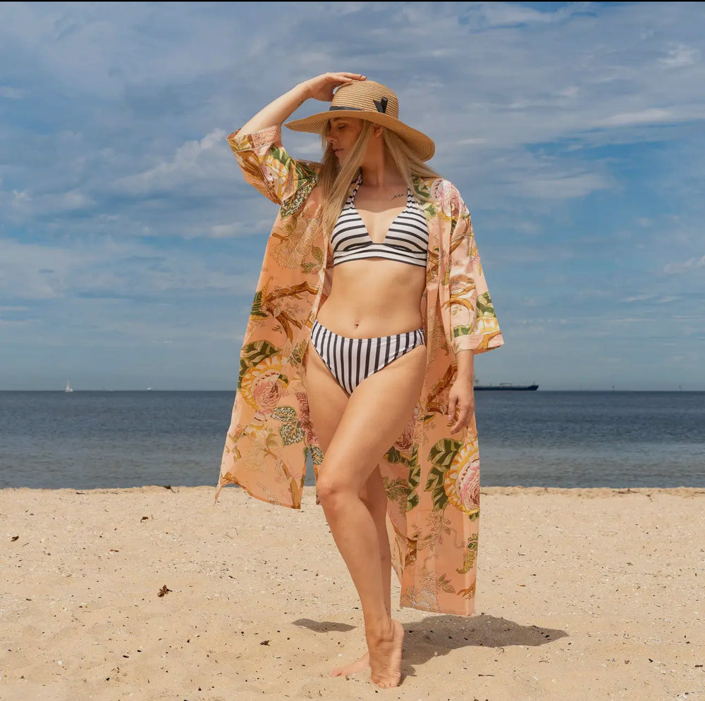 This soft and cozy 100% cotton cambric kimono robe was designed in Australia and hand block printed by skilled artisan in India. Wear this beautiful robe while binging on Netflix or as a cover up by the pool or beach. Comes with matching belt and two pockets. Machine wash/cool dryer.