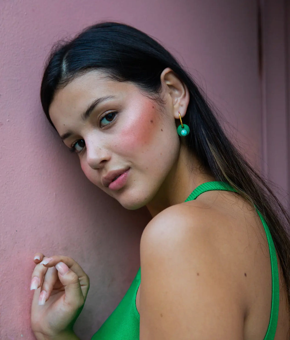 These stunning Deco inspired earrings add just enough glam to any outfit. Made in the U.S.A. from a veteran and woman owned company. Materials are acrylic, a glass rivet accent, 14 carat gold plated surgical stainless steel hoops. Size is 1.25" tall and .5" wide. Image on model is for size reference only.