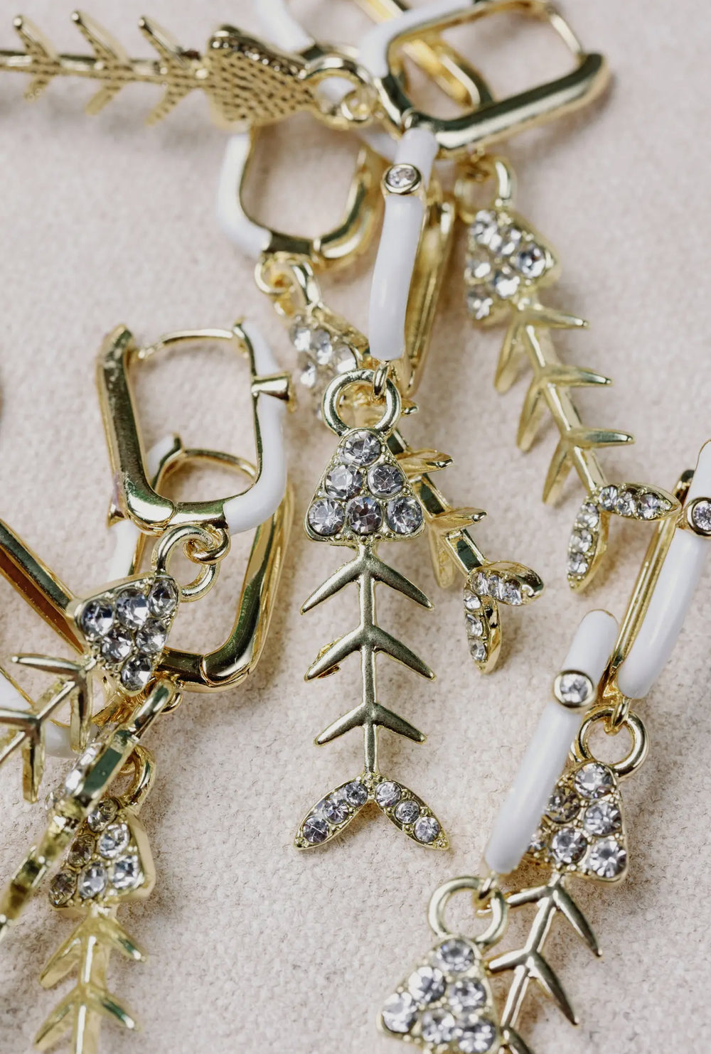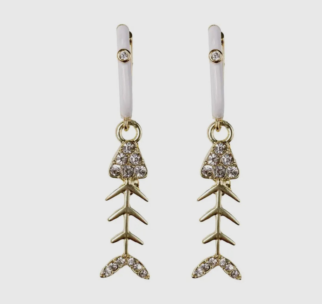 Diamond Bonefish Drop Earrings-Gold/White Enamel