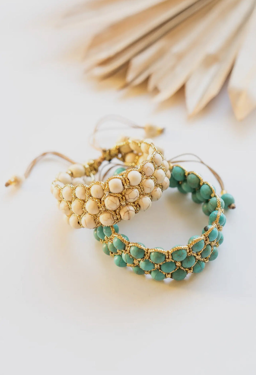 This gorgeous genuine stone bracelet is woven onto a gold nylon cord is ethically made by skilled artisans in Bali, Indonesia. It features a pull closure for an adjustable fit. It will be a stunning complement to any outfit.