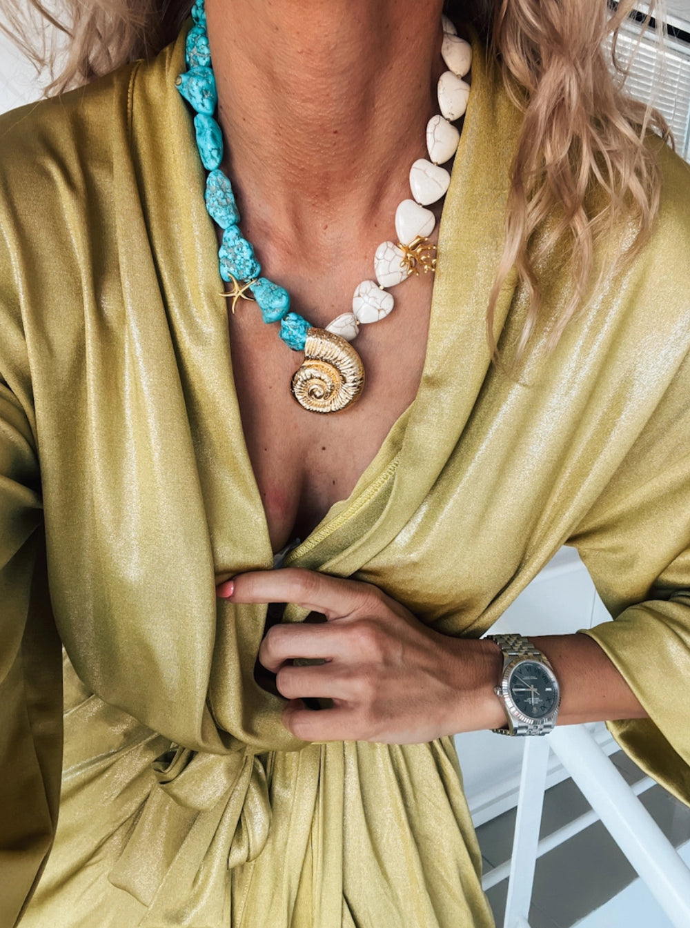 Gold plated seashell with turquoise and semiprecious howlite stones necklace