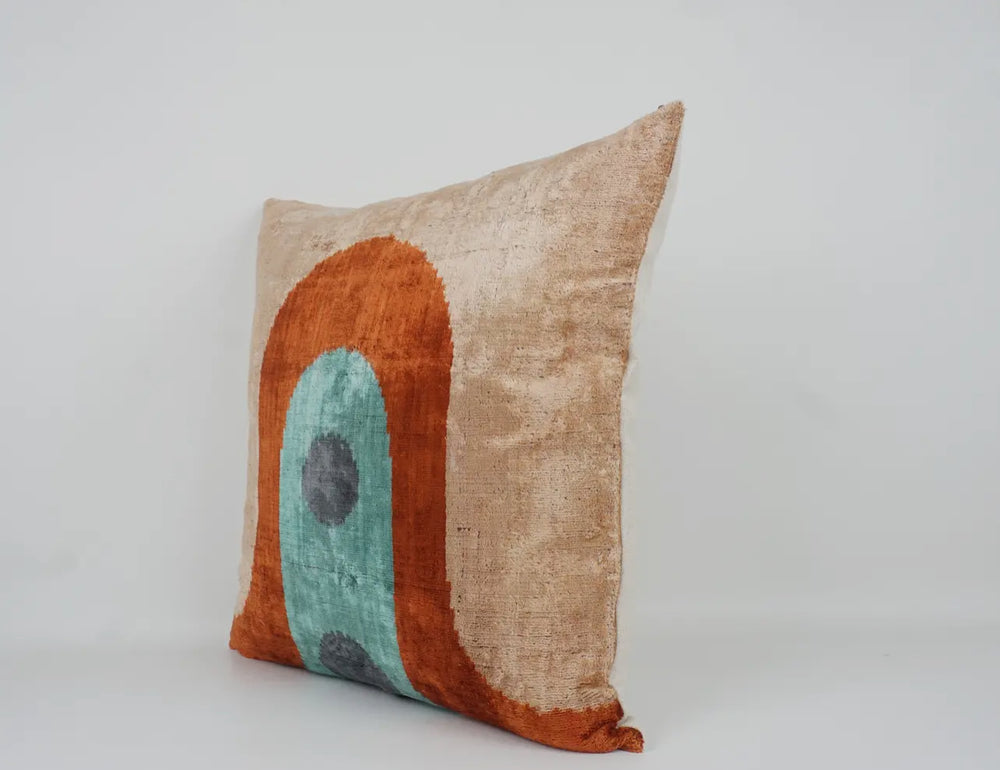 Graphic 100% Silk Velvet Ikat Throw Pillow-Rust//turquoise/tan 20"x20"