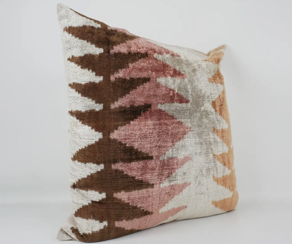 Add style to any modern interior with this limited edition 100% silk Ikat velvet throw pillow. Hand woven by skilled artisan in the mountains of Turkey, this sumptuous velvet takes three days to produce. Gorgeous colors of brown, blush and cream will complement any decor. Pillow comes complete with high quality insert and hidden zipper. Dry clean only. 24"x24". Imported.