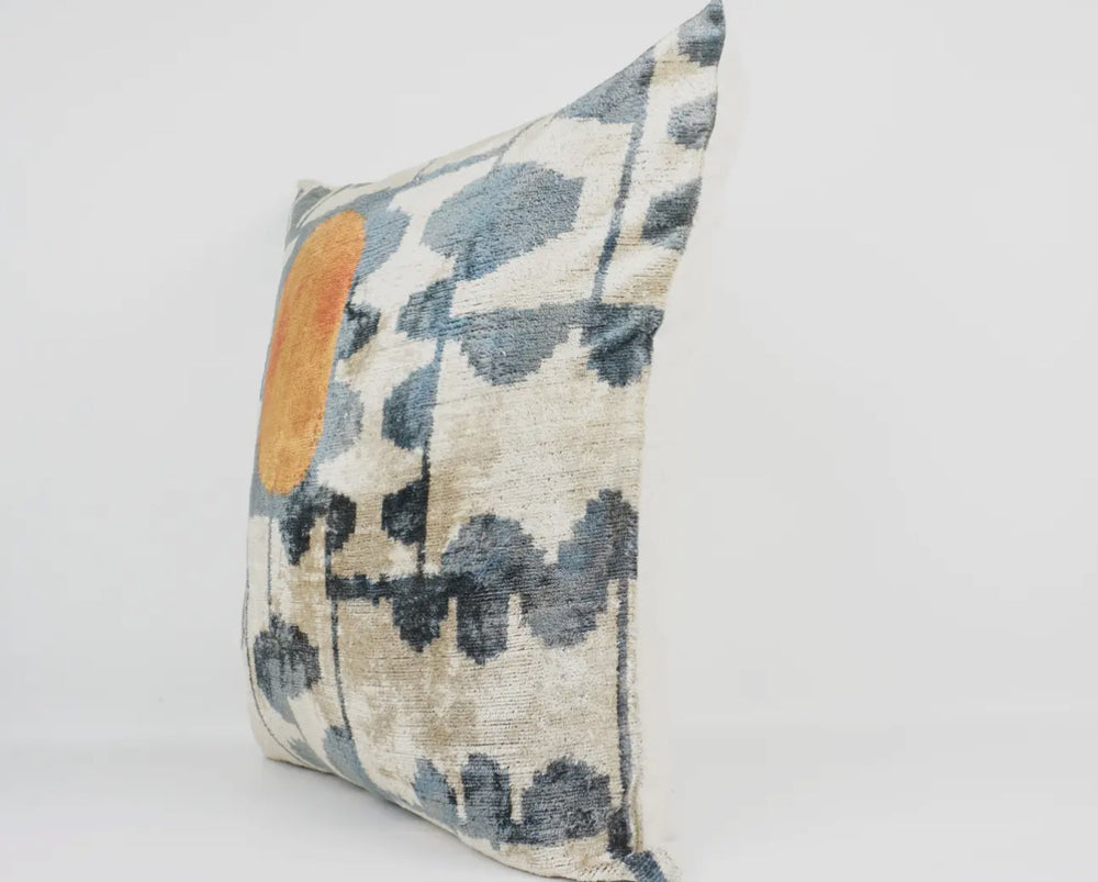 Add some style to your modern interior with this plush and sumptuous 100% silk velvet Ikat throw pillow. The fabric is hand woven by skilled artisans in Turkey. This graphic pattern with gorgeous colors of rusty orange and steel blue on a cream ground is a limited edition design. Pillow comes complete with high quality insert and hidden zipper. 24"x24" Dry clean only. Imported.