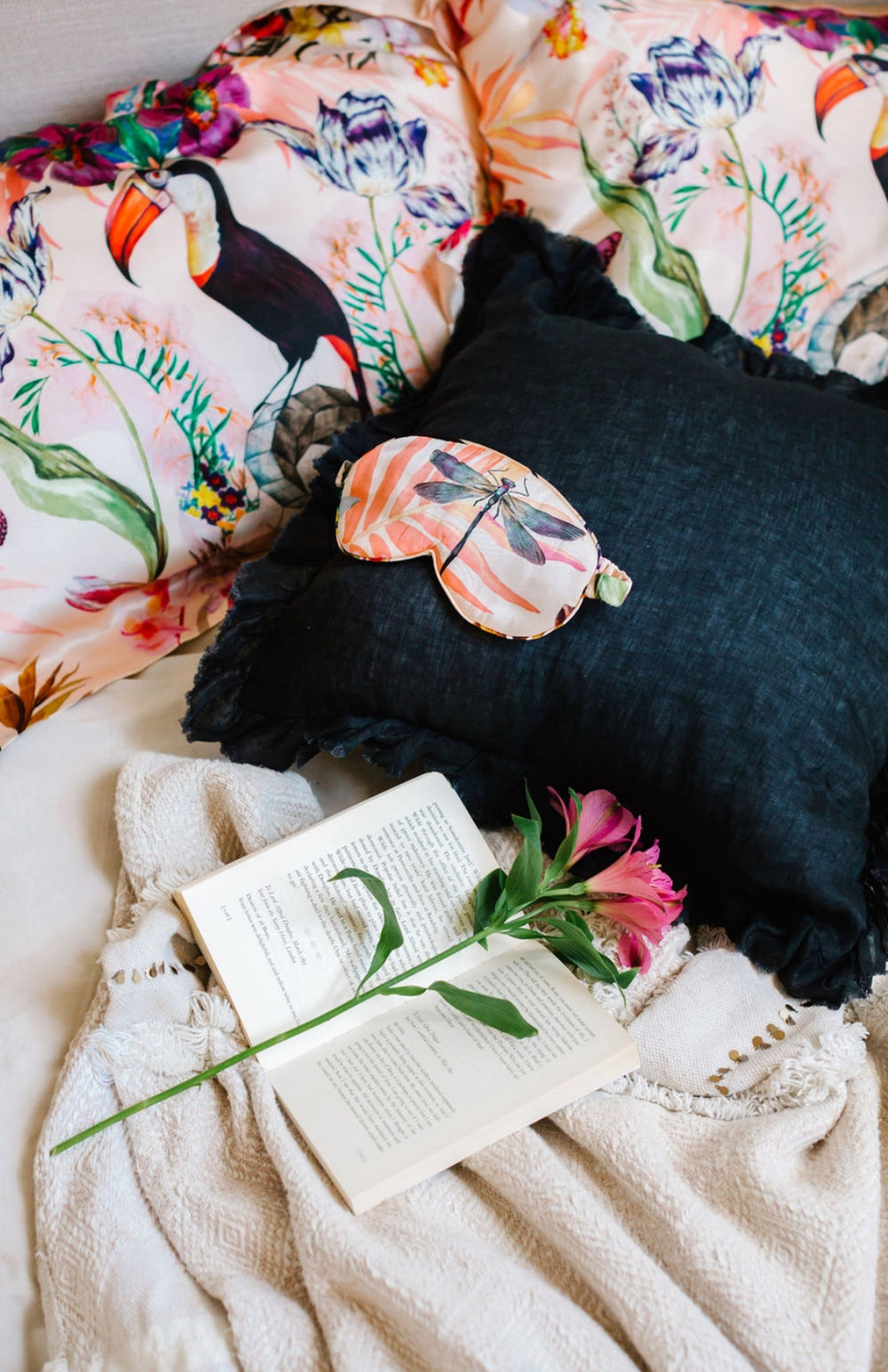 These sumptuous 100% silk satin eye masks are just what the doctor ordered for a great night's sleep. Hand made with hypoallergenic high quality silk, this gorgeous eye mask will make sleeping a pleasure. This luxe mask is a great way to switch off from the stresses of daily life and unwind in serene luxury. Each mask has an elastic head band and is double sided with print on each and can be reversed if desired. The Eden design was hand painted by renowned UK artist, Alice Acreman,  using watercolors in tones which replicate warm cast sunlight and digitally arranged to create a calming scene blending tropical vibes with calm meadows.