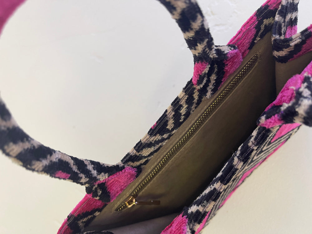 Medium 100% silk velvet Ikat tote-hot pink and black geometric pattern