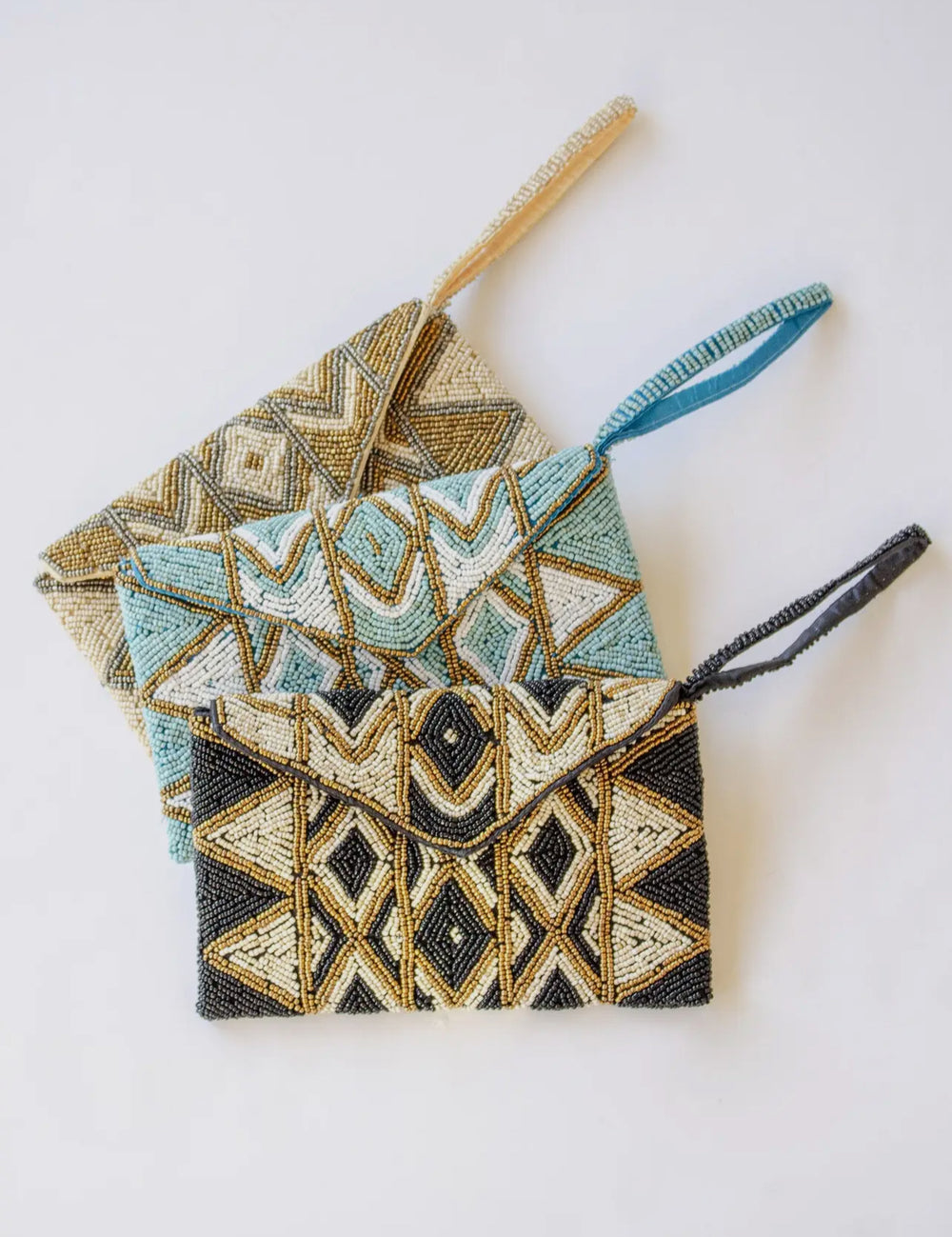 This handmade wristlet showcases intricate glass beading in a stunning mosaic design. Features a zipper and magnetic clasp for added security, making it a standout piece for any outing. Ethically made in Bali, Indonesia by skilled artisans. 8"x4.5" , 5' Wristlet strap.