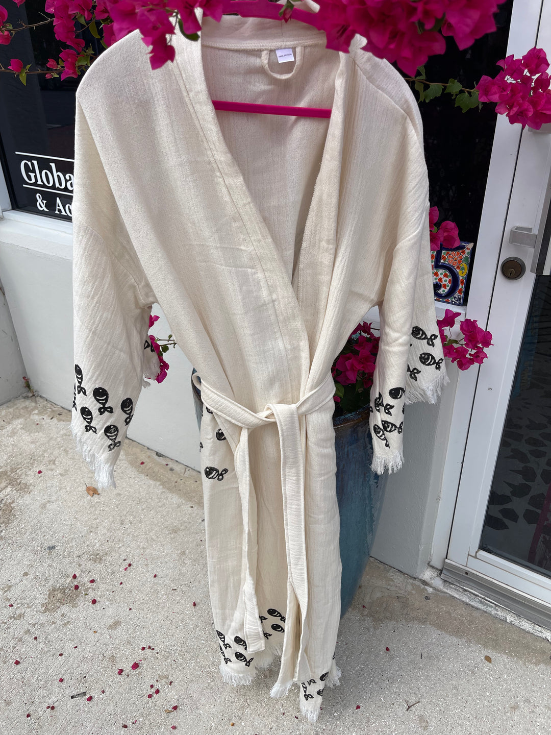 This one of a kind, super soft and luxurious Kimono robe is will quickly become your go to item for lounging by the pool, after a day at the beach, or just relaxing in at home. It's made with 100% organic cotton and hand stamped on front and back with whimsical fish motifs by skilled artisans in Turkey. One size fits most. Hand wash.