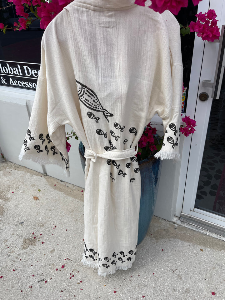 100% Organic Cotton Kimono Robe with Hand-Stamped Fish Motif