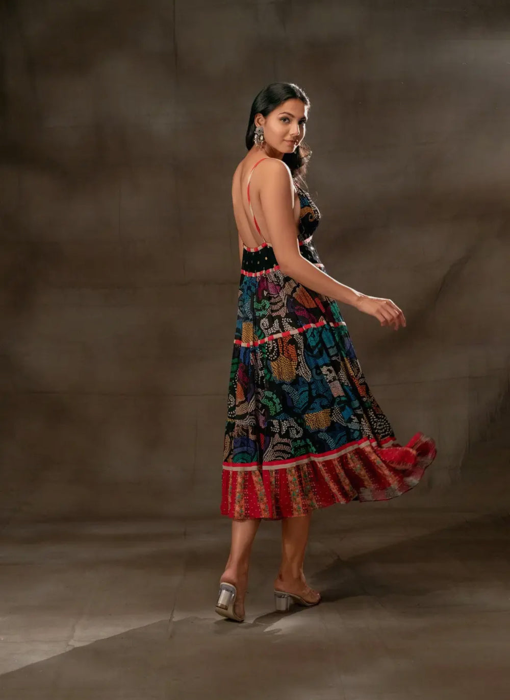 This playful paisley printed spaghetti strap dress is perfect for a pool party or a night on the town. Made with a classic black viscose georgette with sequenced detailing. Dry clean only. Made in India. Size: Small