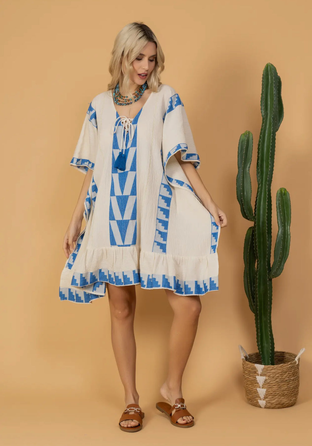 Short Boho Styled Aegean Inspired Tunic Dress-Sky/White
