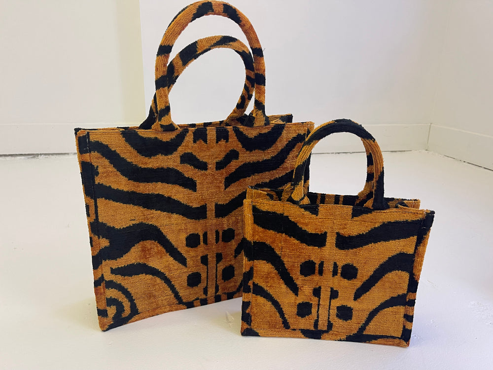 Small 100% silk velvet Ikat tiger patterned tote bag