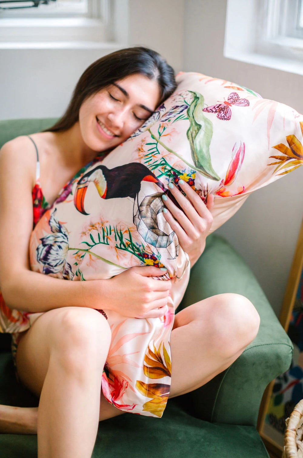 This exquisite hand painted 100% satin silk pillowcase will make you swoon! This luxurious silk work of art is hand painted by Alice Acreman, a fantastic artist based out of the UK. These one of a kind designs will add a bit of luster to any boudoir. This gorgeous pattern, Eden, has a whimsical toucan taking center stage surrounded by tropical foliage. Simply slip over your favorite pillow and let the natural fibers work their magic on your hair, skin and overall health while you sleep. Silk is naturally hypoallergenic and comfortable. Comes one pillowcase per box. Machine wash using cold water and iron on low heat. Dimensions: 30" wide by 20" high