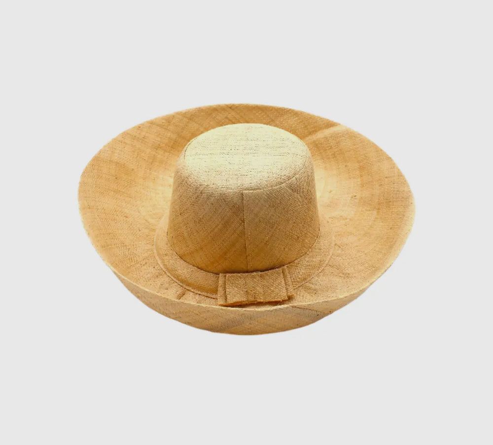 Hand dyed, natural raffia palm fibers are hand loomed into vivid multicolor bands, carefully woven into wide width stripes for a captivating swirling pattern. The brim on this hat is 7". The bell shaped malleable brim is easily shaped many ways to suit your own personal style. One size fits most. Rounded crown and slim hat band with flattened double bow embellishment complete this lightweight, flexible and packable sun protector. Made in Madagascar.