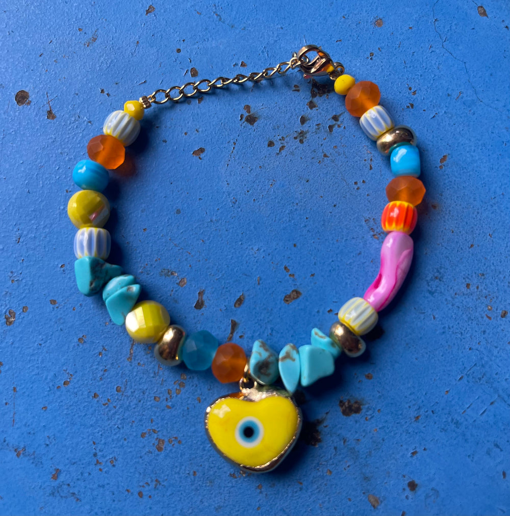 Yellow evil eye with rainbow glass and ceramic beads bracelet